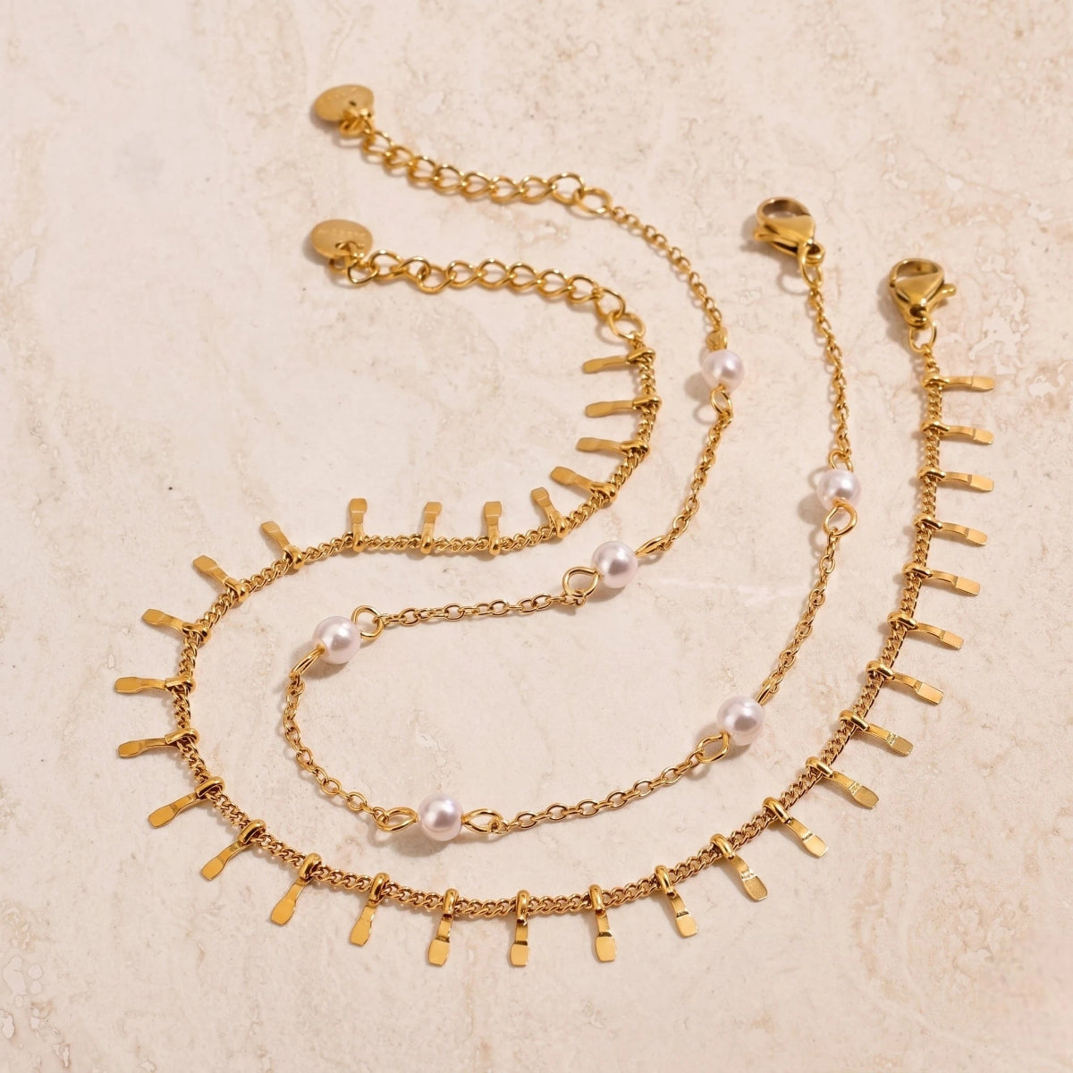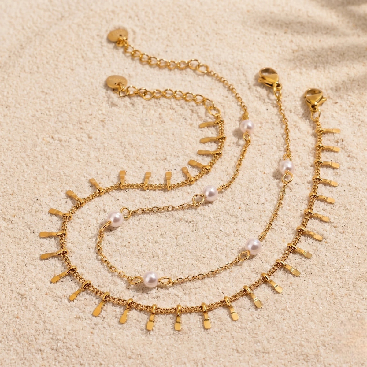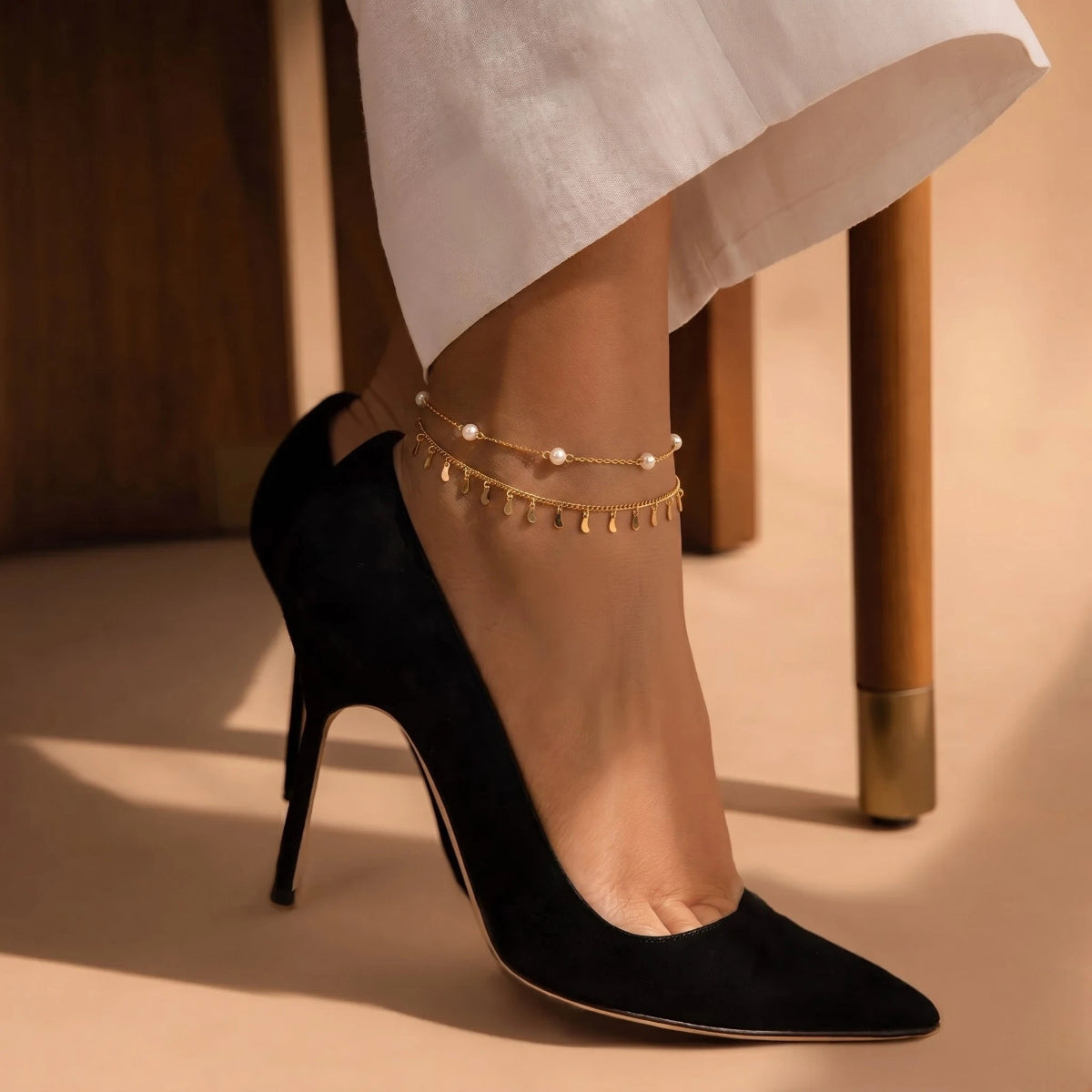 סט צמידי רגל מונקו מורכב משני צמידים נפרדים, עדינים ואלגנטיים, המשתלבים יחד בצורה מושלמת: צמיד פניני מים מתוקים טבעיות למראה קלאסי, רך ומואר, לצד צמיד תליוני זהב המוסיף ברק יוקרתי ותנועה עדינה. השילוב ביניהם יוצר מראה עשיר שמשדרג כל לוק – ממכנסיים לעבודה, דרך שמלה לערב ועד בגד ים בחופשה.