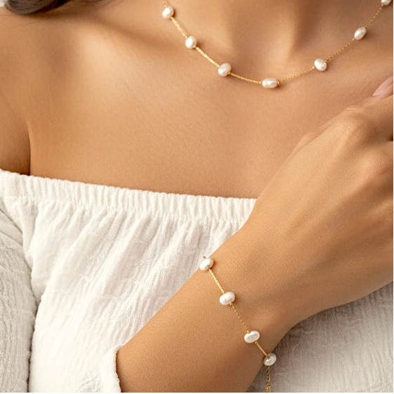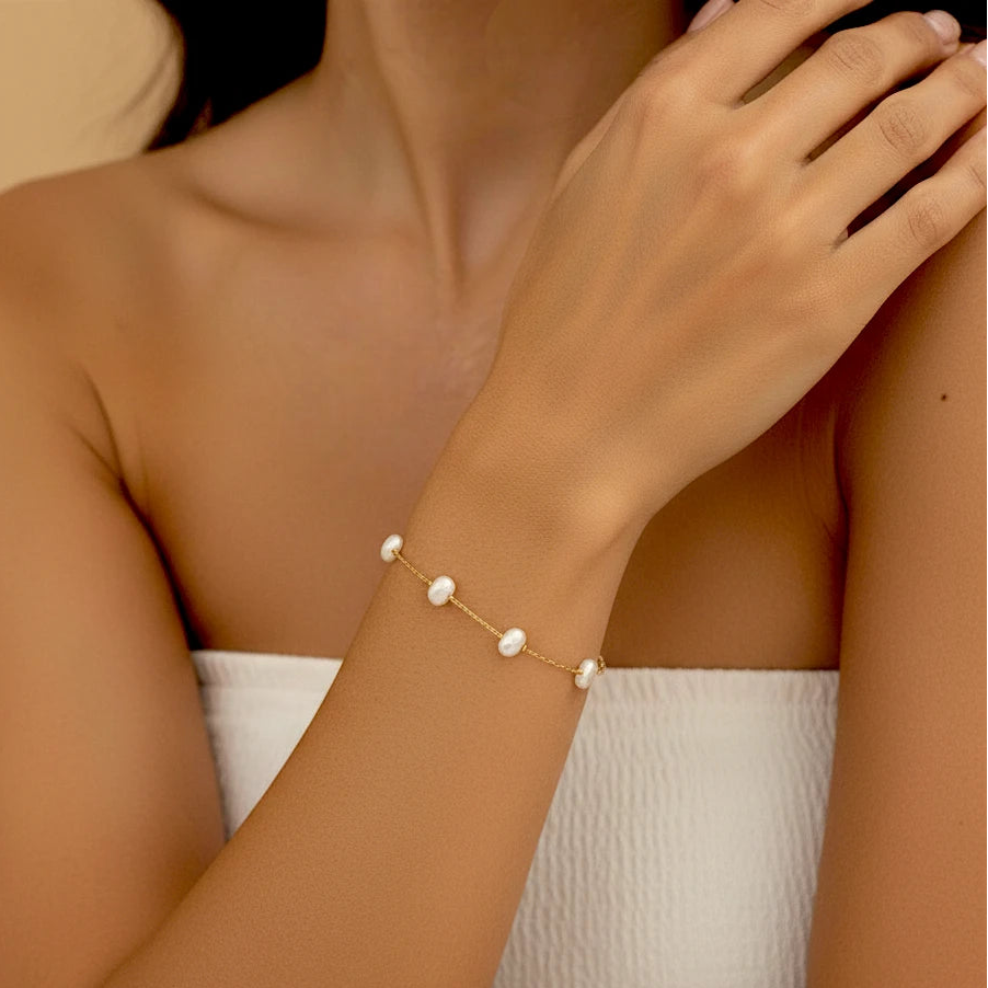 צמיד דליקט הוא התכשיט המשלים המושלם ללוק נקי ומעודן. בדיוק כמו השרשרת התואמת, גם הוא משלב שרשרת חוליות זהב דקות ומוארכות עם חרוזי פנינה במראה אורגני (לא סימטרי) המפוזרים בקלילות. הוא עומד בפני עצמו כפריט קלאסי, אך משתלב נהדר גם ב-Stacking עם צמידים נוספים.