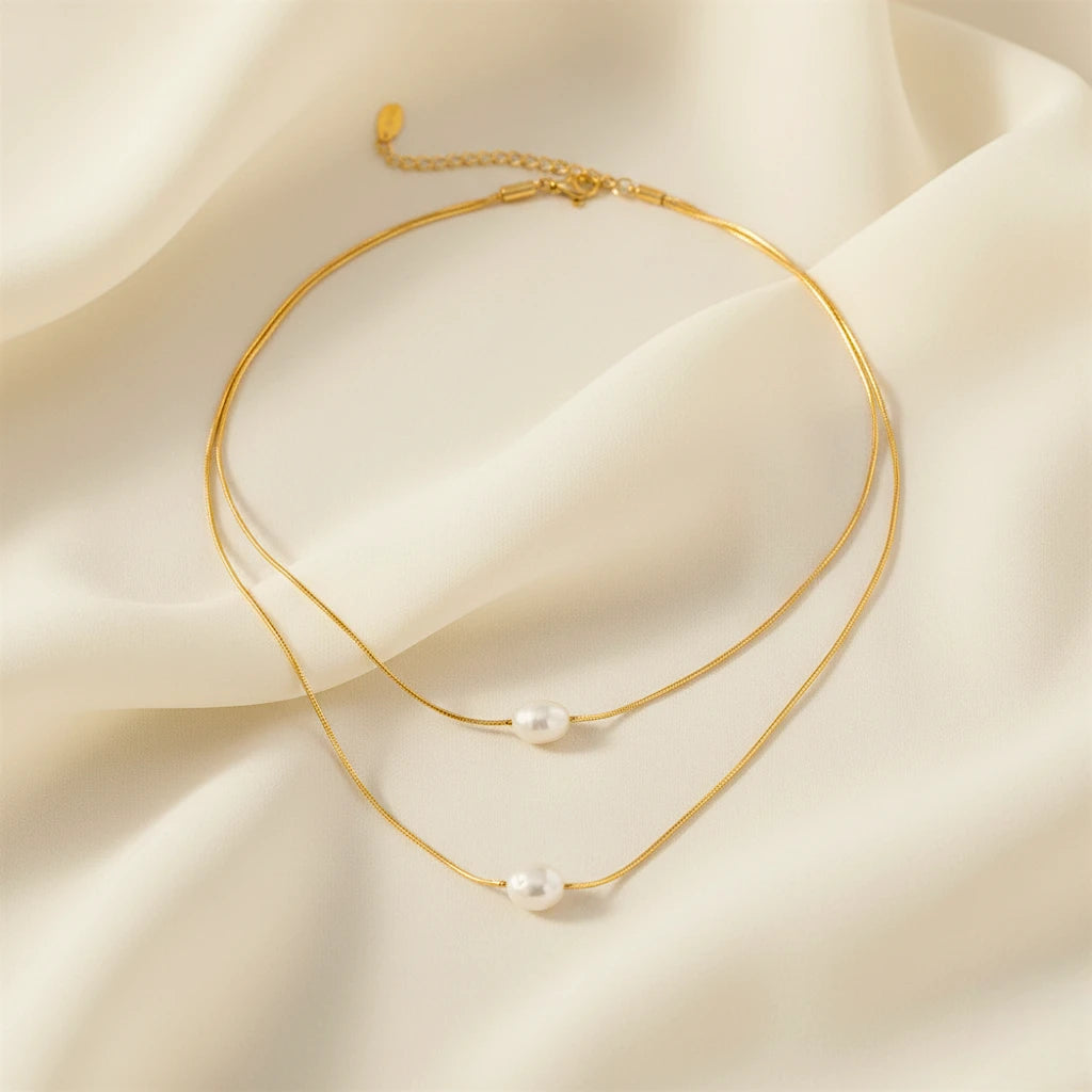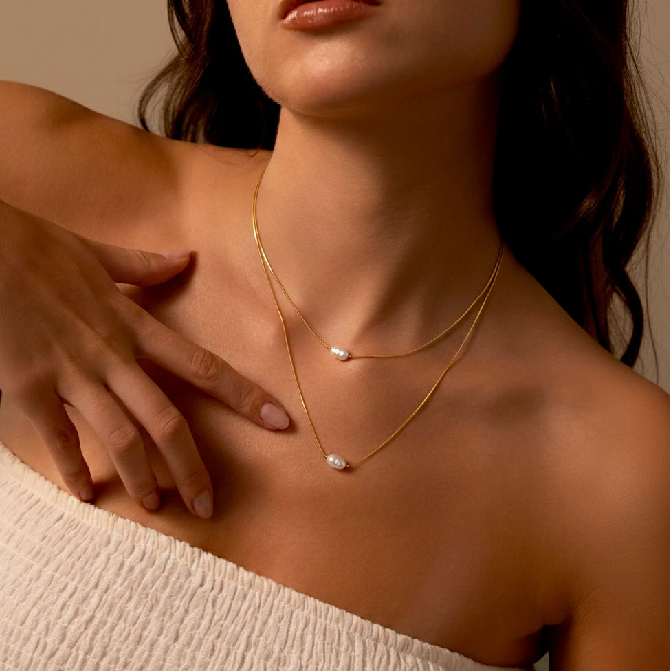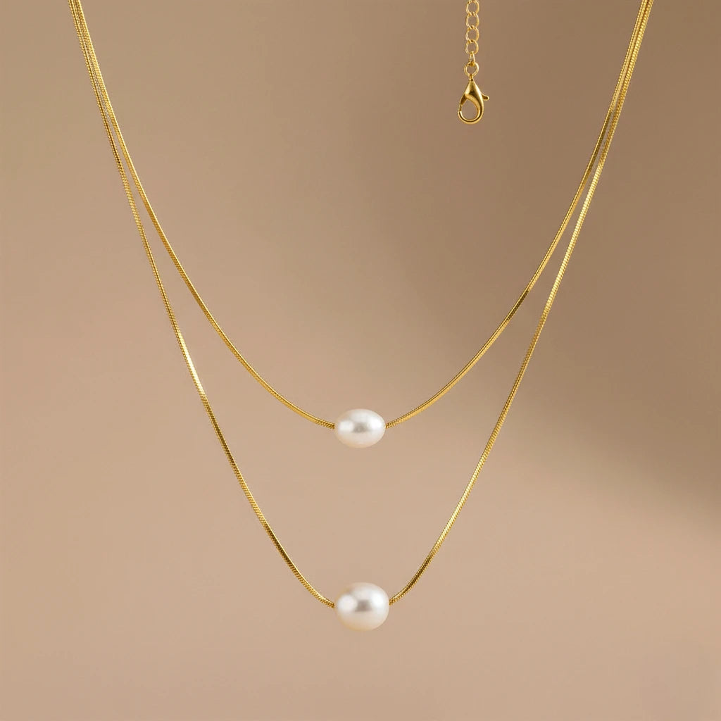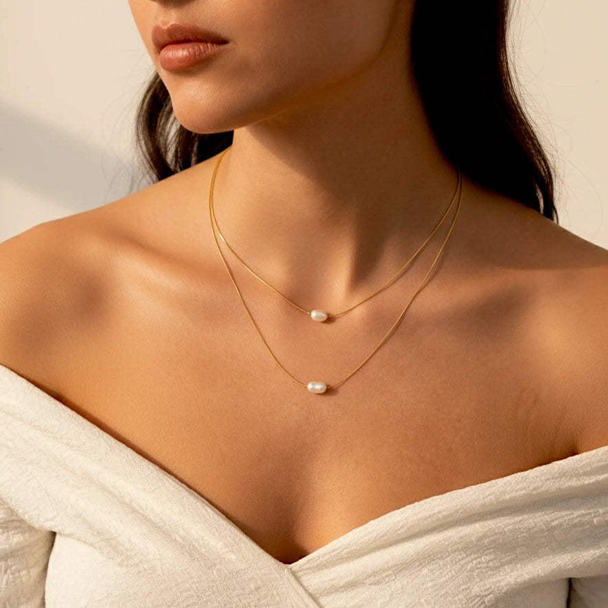 שרשרת לוסיה היא שרשרת רומנטית ועדינה, שמוסיפה זוהר מינימליסטי לכל לוק. מורכבת משתי שרשראות סנייק דקיקות בעלות טקסטורה חלקה ומבריקה, כשכל אחת מהן נושאת תליון של פנינת מים מתוקים טבעית (Freshwater Pearl) בגוון לבן רך. השילוב יוצר מראה נקי, קלאסי ויוקרתי – כזה שמשדרג כל הופעה ברגע, מג’ינס וטי־שירט לבנה ועד שמלת ערב לחתונה.