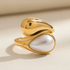 טבעת אלגנטית ומרשימה בעיצוב פתוח בשיבוץ עם אבן לבנה, המדמה שני אלמנטים נוזליים שנפגשו – זהב חלק שמחבק פנינה לבנה מבריקה. נוכחות מרשימה על כל יד.