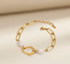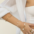 הניגוד בין פני המתכת החלקים לצורות הפנינה הלא אחידות מדגיש את המבנה הגולמי של הצמיד.